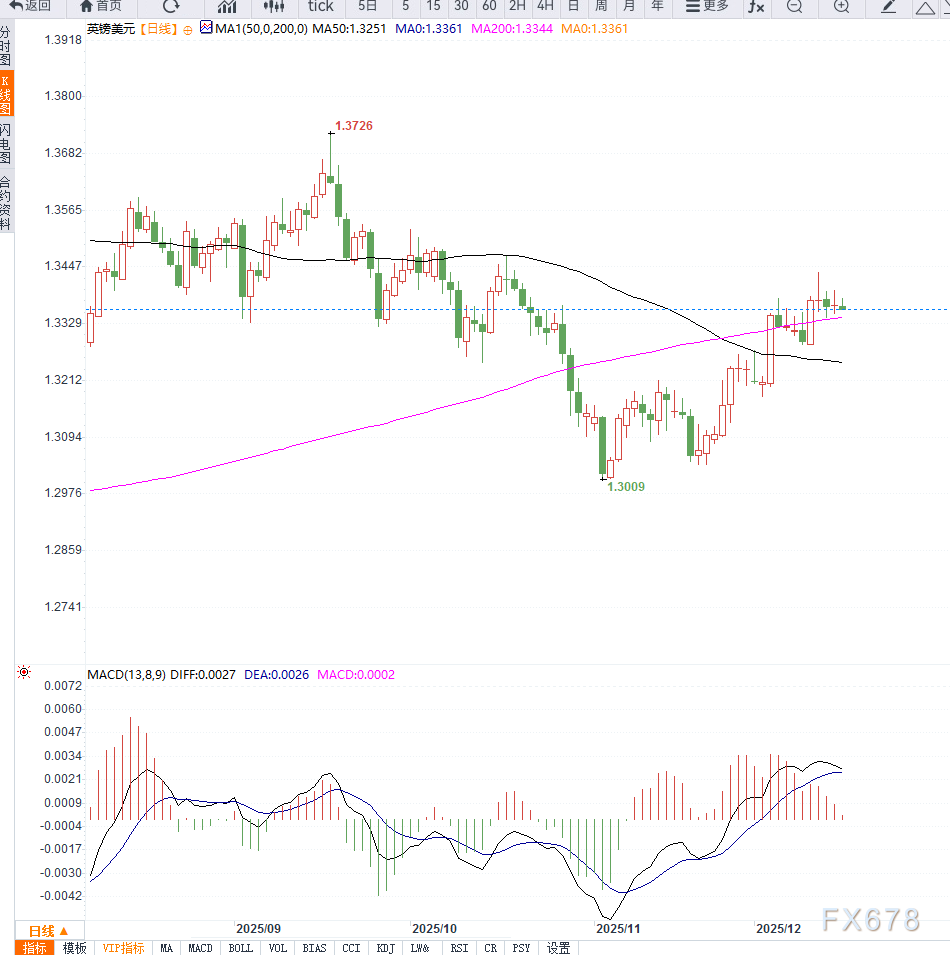 不过,在基本面不确定性消除之前,上方空间仍可能受到限制。总体来看,技术面显示英镑兑美元正处于方向选择前的蓄势阶段,200日均线的得失将成为判断短线走势的重要参考。