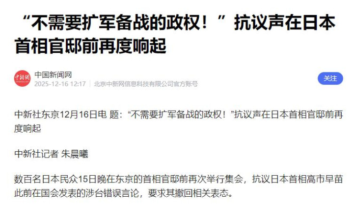 12月的东京寒风凛冽,但首相官邸前的抗议人群却越聚越多。15日晚,数百名日本民众举着“撤回危险言论”“高市下台”的标语牌,高声呐喊着对现任政府的不满。他们的愤怒,源于高市早苗此前在国会的一番谬论——将“台湾有事”与日本的“存亡危机事态”绑定,公然突破战后日本长期坚持的外交底线,把地区和平稳定当成了自己政治投机的筹码。