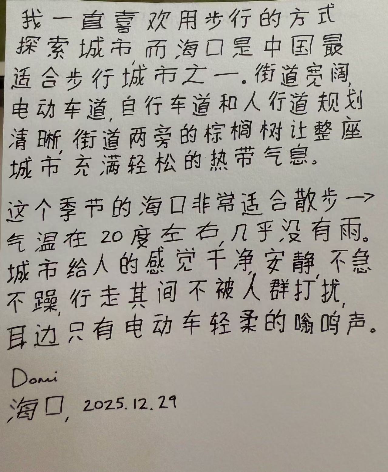 来自英国的Domi也提到,海南的街道规划清晰,适合步行,棕榈树和热带风情让城市显得轻松惬意,“这个季节的海口气温在20摄氏度左右,几乎没有雨,城市安静不躁,耳边只有电动车轻柔的嗡鸣声。”